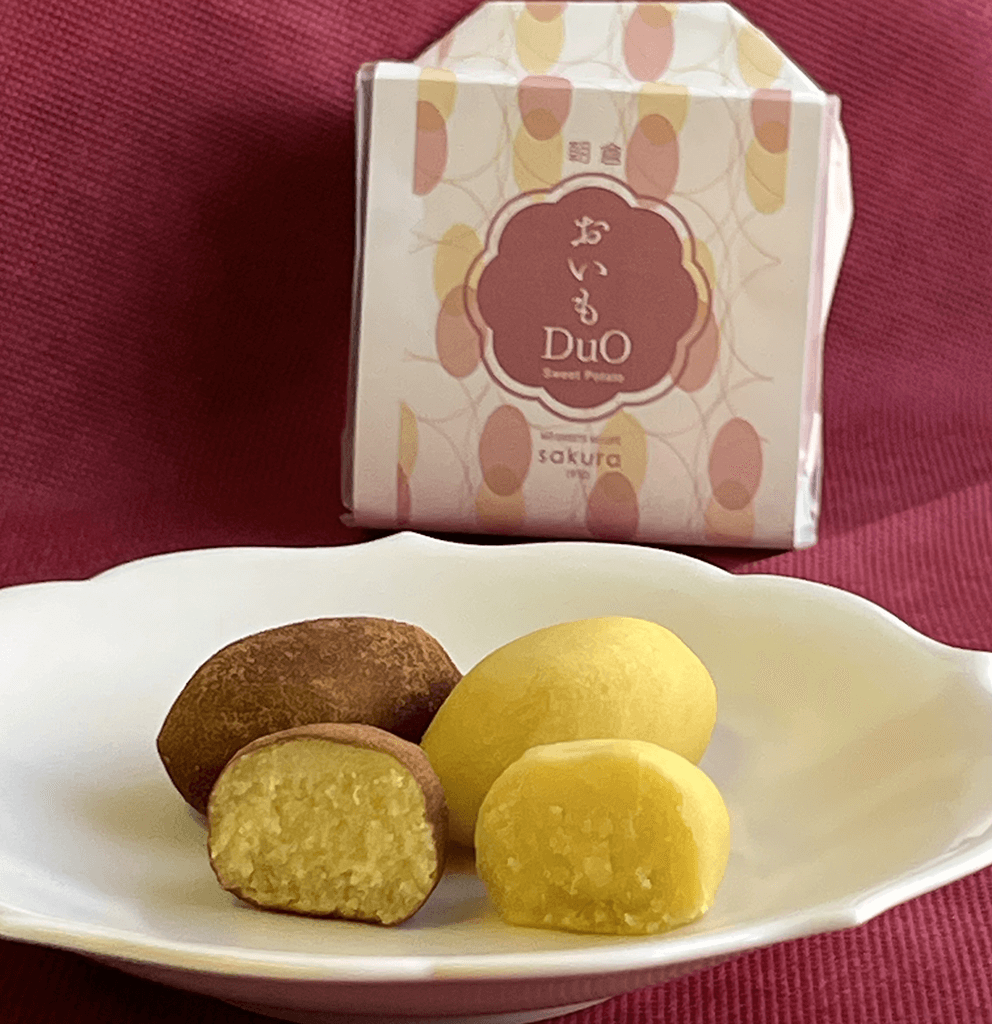 秋冬に特に長くご好評いただいているSAKURAの60年以上のロングセラー「おいも」を25年度より更に美味しく作り替えました。おいもの餡は2種類の味わいを楽しめるようにそれぞれ変えています。一つのパッケージにこれまでのテイストであるシナモンをまぶしたもの。もう一つは、よりクリーミーな味わいの素焼きを一つのパッケージに詰めて2重奏=DUO(デュオ)でご提供。
